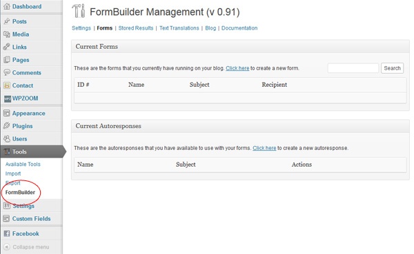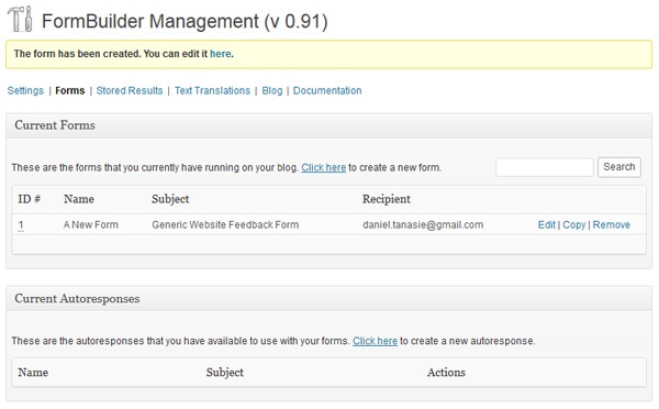 Din meniul Forms -> Current Forms creem un nou formular prin accesarea linkului „Click here” (neinspirat mod de a crea un formular). Se va crea un formular generic de c0ntact. Imaginea următoare arată conținului ferestrei Forms după crearea primului formular: