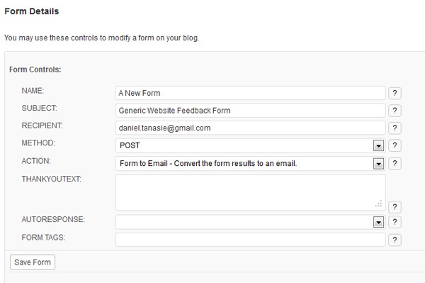După creare se face click pe Edit și se accesează pagina de modificare a formularului. Această pagină este inițial formată din trei câmpuri: nume, email și comentarii. Aceste câmpuri sunt gata setate, însă ele pot fi șterse, mutate sau modificate conform dorințelor noastre sau a specificațiilor clientului.